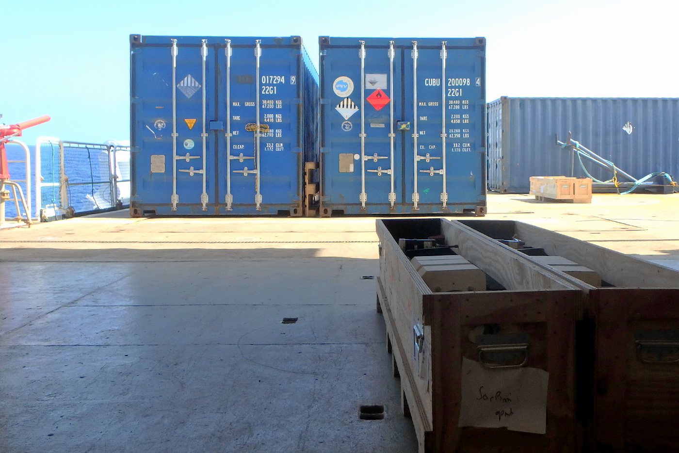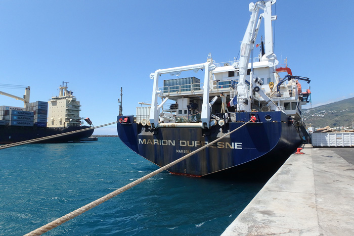 The shipping containers with the scientific material are delivered to the Marion Dufresne in La Reunion.