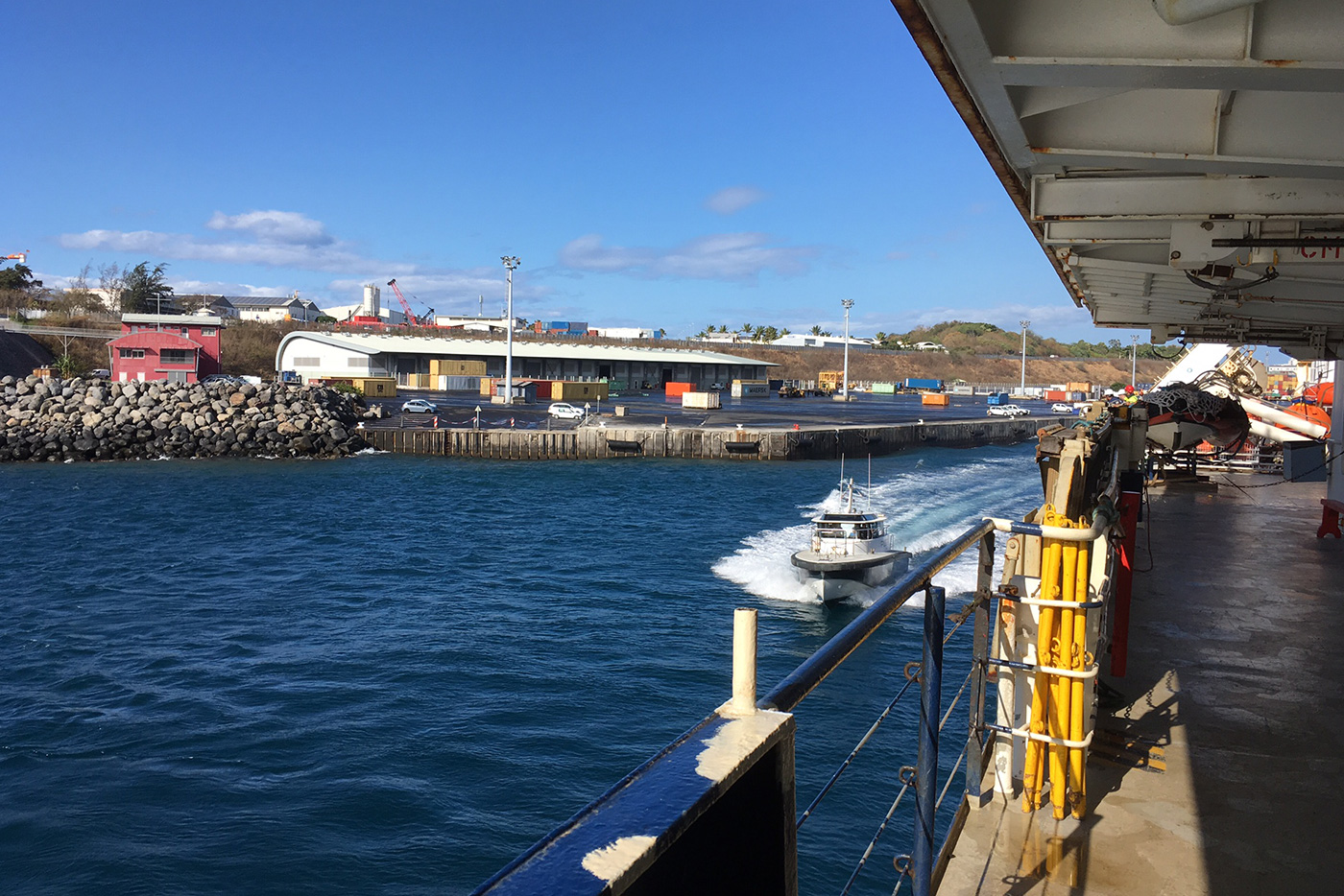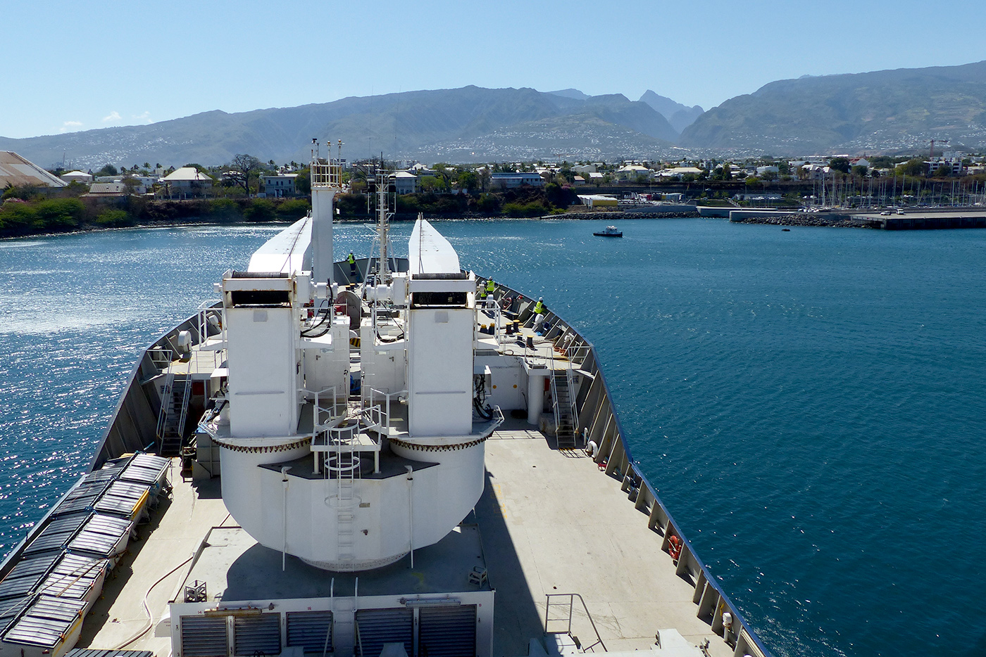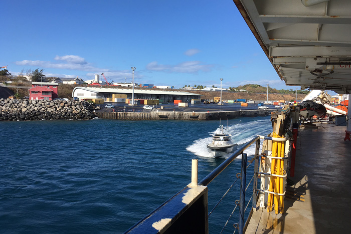 The vessel stops at Mauritius Island for refueling. All the walkways have been cleared and the equipment packed by now.