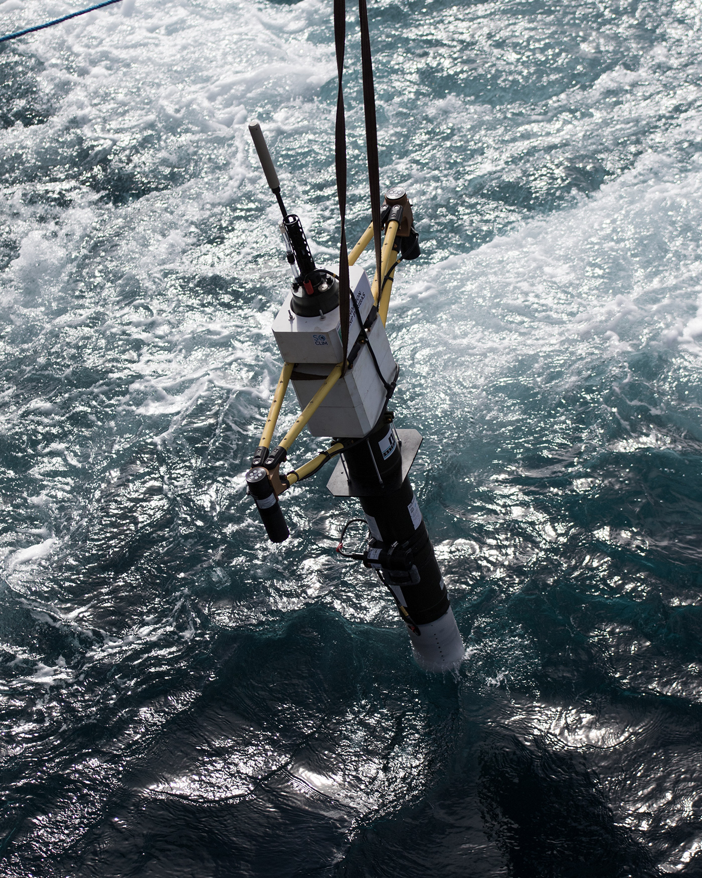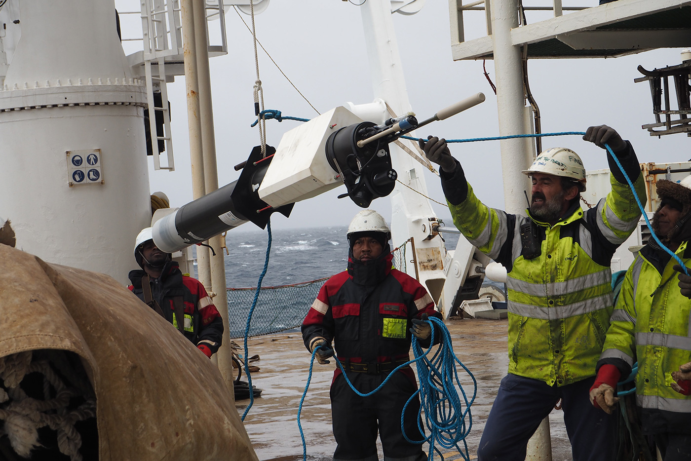 Our vessel has now reached the eastern side of the Kerguelen Plateau where the waters are naturally enriched in iron, leading to enhanced phytoplankton biomass compared to surrounding waters. Here we deploy three different moorings: two sediment traps that will tell us about the fluxes of particulate organic matter over the next season, and one ADCP (Subsurface Acoustic Doppler Current Profiler) that will measure the currents in the area.
